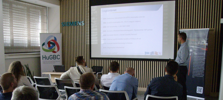 Az integrált Building Managemenet System (BMS) további lehetőségeiről, a tűzjelzésről, az oltásvezérlés, a video megfigyelésről, a beléptetés kontrollról és betörésvédelemről beszélt Erhardt Tamás a Siemens Building Technologies (HuGBC tag) projekt értékesítője. Tamás áttekintette az EN15232:2012 szabvány előírásit a primer energiaigény tekintetében. A szabvány figyelembe veszi az épülettípust, az automatizálási szintet, az összes épületen belüli diszciplínát, valamint részletes és egyszerűsített számítási módszereket kínál. Középületek kiemelt épületenergiai fejlesztéseinél (KEHOP-5.2.2.) az energiamenedzsment eszköznek meg kell felelnie ennek a szabványnak.