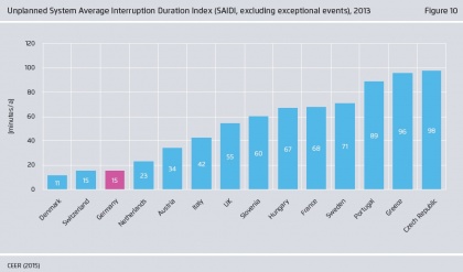 Az ábra azt mutatja meg, hogy adott évben az áramfogyasztók átlagosan hány percig vannak áram nélkül. Azokat az áramkimaradásokat veszi figyelembe, amelyek váratlanul következtek be, azaz nem szándékosan szüneteltette a szolgáltatást a rendszerirányító. Ilyenek jellemzően az időjárási események, pl. villámlás. Az ábrán megjelenített index nem veszi viszont figyelembe az ún. különleges események miatt bekövetkező áramszüneteket. Ezek köre országonként változik: míg Görögországban egy hóvihar extrém eseménynek számíthat, Svédországban nem. (Bővebb információ itt.)